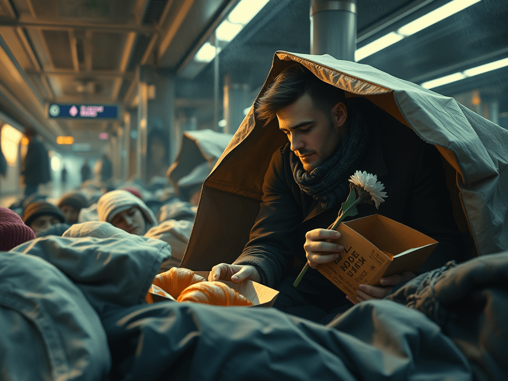 Parmi les participantes les plus assidues, il y avait Evelyne. Elle nous a emmené avec elle, par sa parole, dans son passage hebdomadaire à la station de métro Schuman. Tôt, les mercredis matins. Il y a là des immenses qui dorment encore. Certain.es installé.es depuis assez longtemps pour avoir commencé à créer des espaces à eux. Comme ce monsieur, couché derrière une palissade de cartons sur lesquels était accrochée une fleur en plastique. Tous ces matins où elle passait entre les corps couchés, Evelyn est allé acheter des croissants (« Chacun emballé séparément s’il vous plaît! ») et les a déposés à côté des corps endormis. Un jour, au moment de passer le tourniquet du métro, elle s’est retournée. L’homme à la fleur en plastique a émergé rapidement de dessous ses cartons. Il voulait voir : qui déposait inlassablement ces croissants une fois par semaine? Leurs regards se sont croisés.